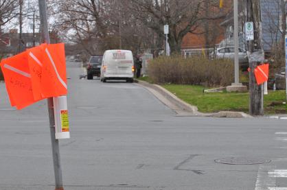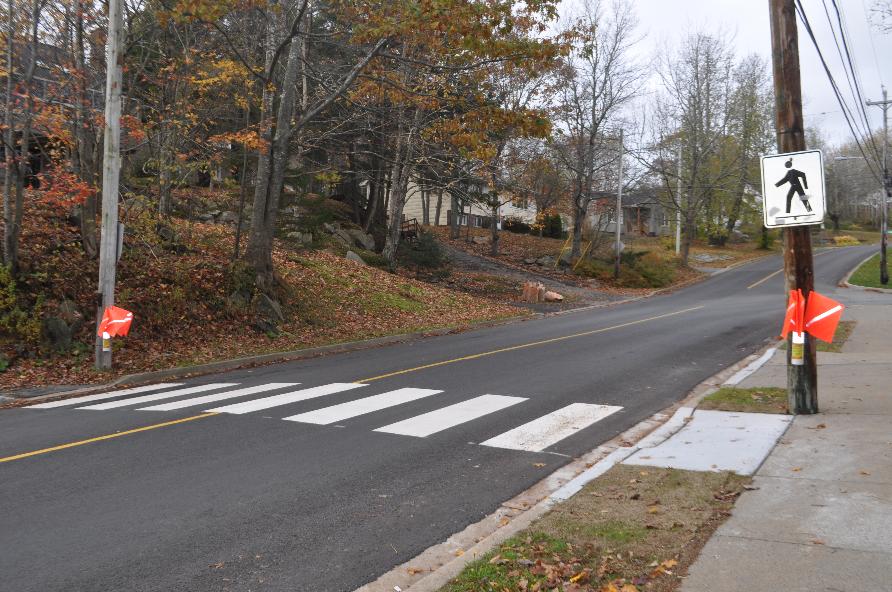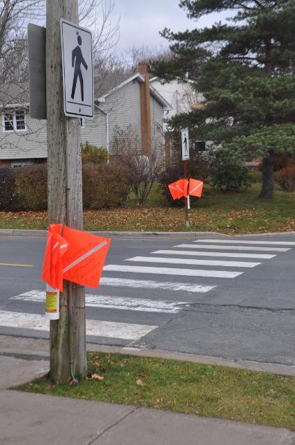 Another issue is whether crosswalk flags would be allowed at unmarked crosswalks. Here again Halifax traffic has demonstrated a willingness to work with communities in allowing crosswalk flags at these locations where it is the wish of the community - provided a post, other than one with a stop sign exists. In other words crosswalk flag buckets cannot be attached to stop sign posts and residents are not allowed to insert their own posts in the right of way. But if there is for example a Nova Scotia power pole, or say a speed limit post then they can also be used for crosswalk flags.