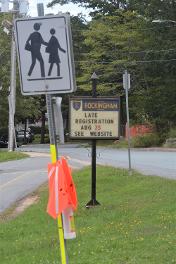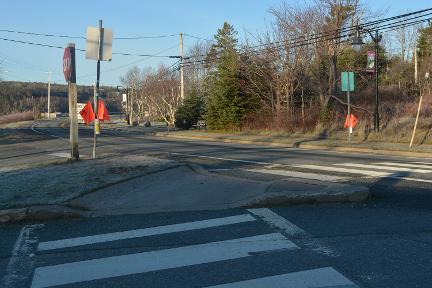 Crosswalk flags installed at 2283 St. Margaret's Bay Road at Brentwood Avenue, entrance to Greenwood Heights, Timberlea